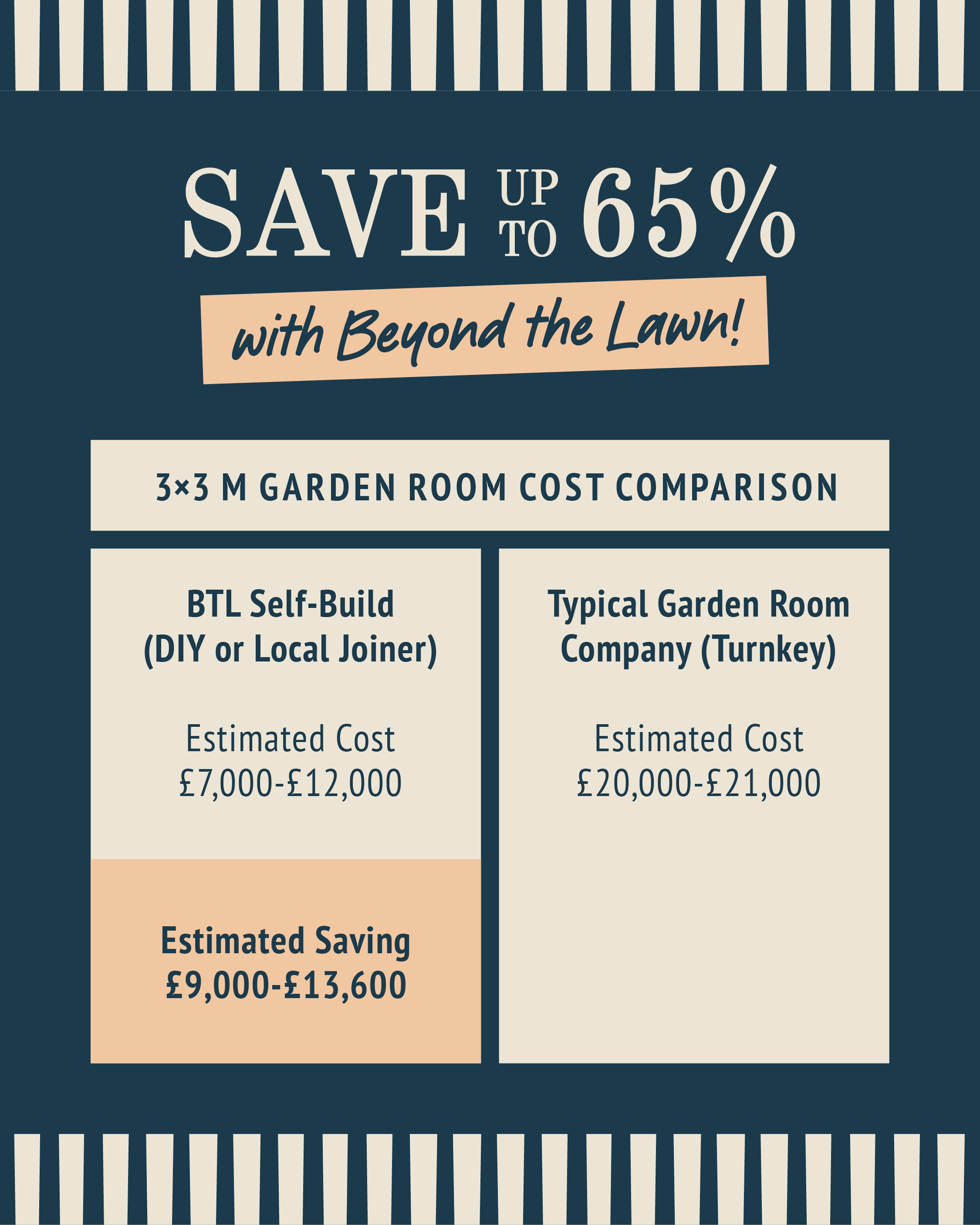 Costs can vary depending on size, specification, and finish. As a guide, a self-build timber garden room in 2025 typically ranges from £8,000–£25,000, including materials. Premium finishes, insulation upgrades, and bespoke designs may increase this.