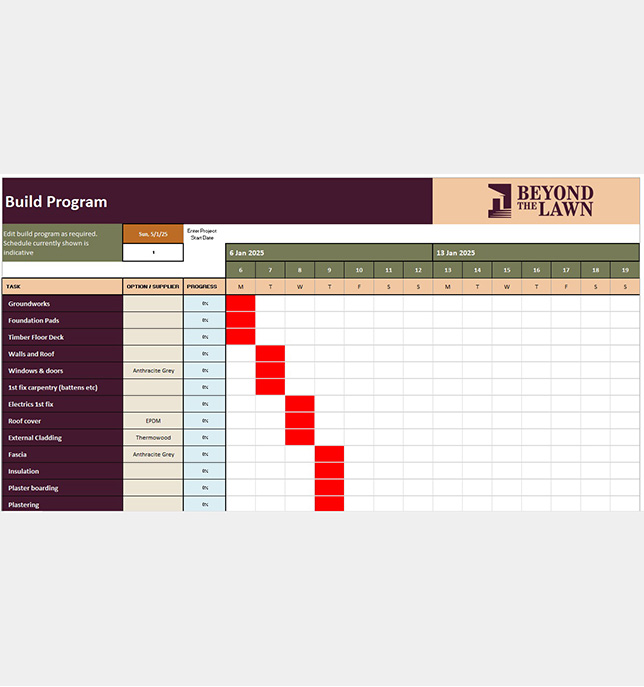 The digital kit includes full construction layout drawings, 3D visualisations, fabrication drawings, build program template, cut lists, and material schedules — plus a step-by-step assembly guide. We also offer sourcing recommendations for local material suppliers and installers.